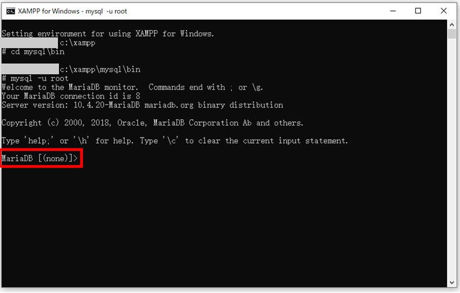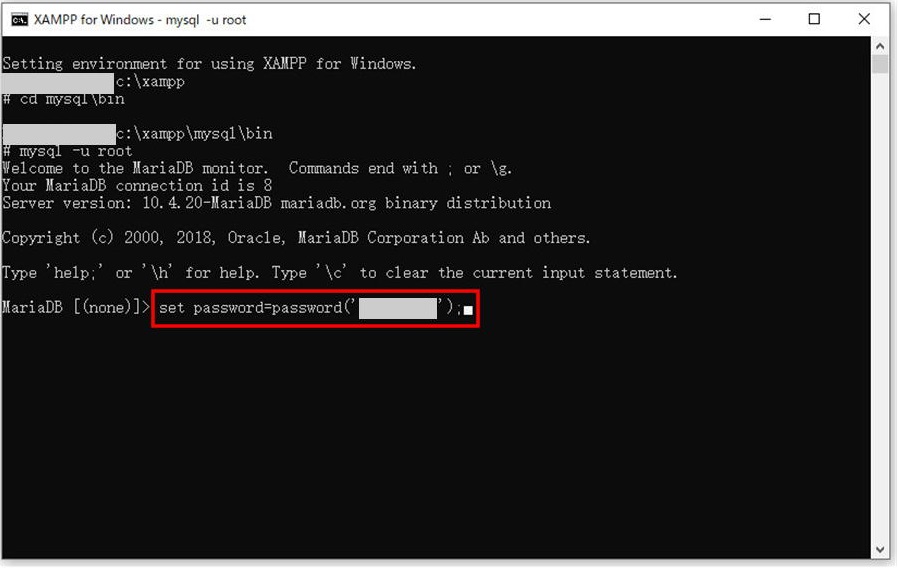 画像の赤枠 MariaDB [(none)]> に続いて、データベースのパスワードを設定するコマンドを入力します。