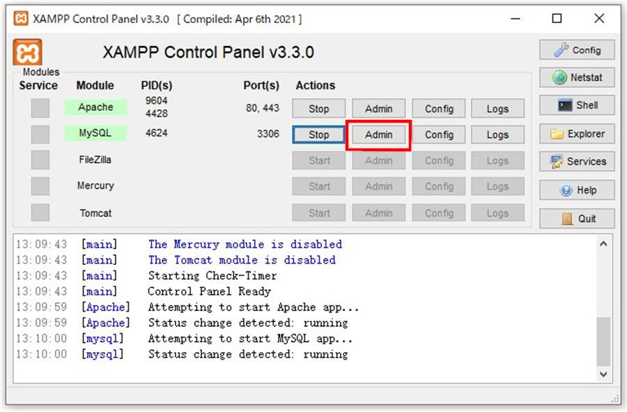 MySQLの行にあるAdminボタンをクリックして下さい。