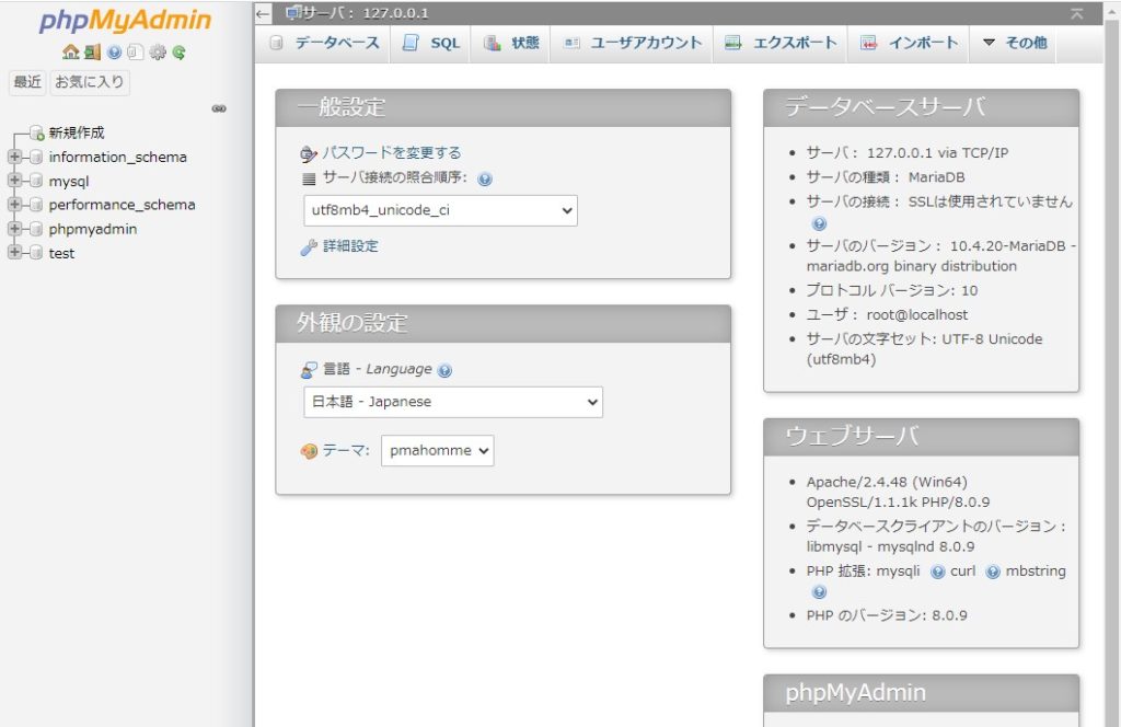 ユーザー名は『root』、パスワードは上の方で設定したデータベースのパスワードを入れると、ログイン出来ますので、ご確認を。