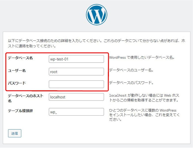 - データベース名:先程作成したデータベース名