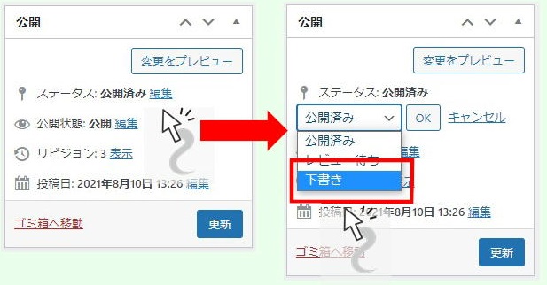 記事編集画面で、『ステータス:公開済み』の横の「編集」をクリック。