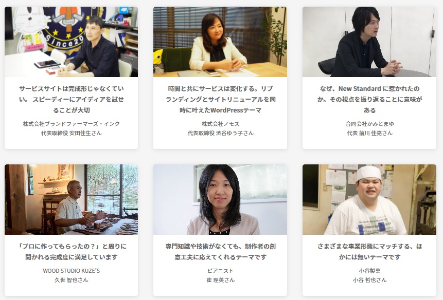 2015年の発売よりNew Standard はあらゆる業種のお客さまにご利用を頂き、掲載事例数は200事業者を突破しました!この数は同一名のWordPressテーマとして国内トップクラスの実績です。ぜひ、お客様事例ページをご覧ください。