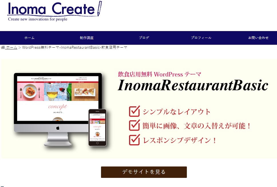 最初にご紹介する無料テーマは、クリエイターの猪股 浩平さん制作のInomaRestaurantBasic。こちらは、無料テーマでありながら飲食店・レストラン用にカスタマイズされた貴重な一本となっています。