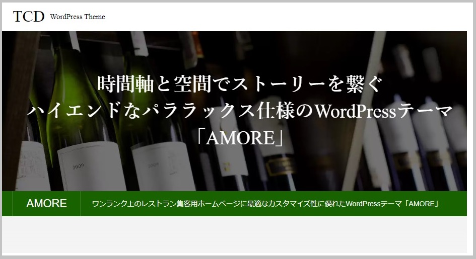 3つめの有料テーマは、多数の業種別有料WordPressテーマを送り出すtcdから「AMORE」。パララックスデザインを採用した、飲食店・レストラン特化型テーマです。