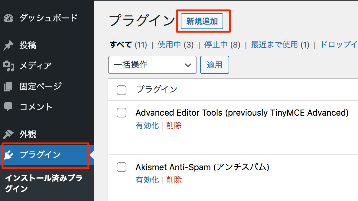 1.WordPress管理画面で「プラグイン」を選択し、「新規追加」ボタンをクリック