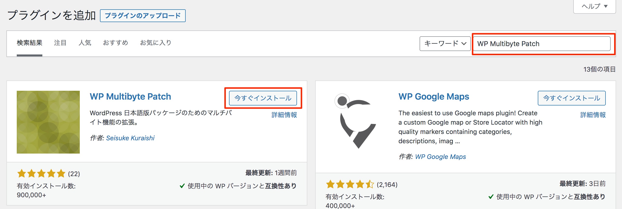 この中で、必ず入れていただきたいのが、「WP Multibyte Patch」です。