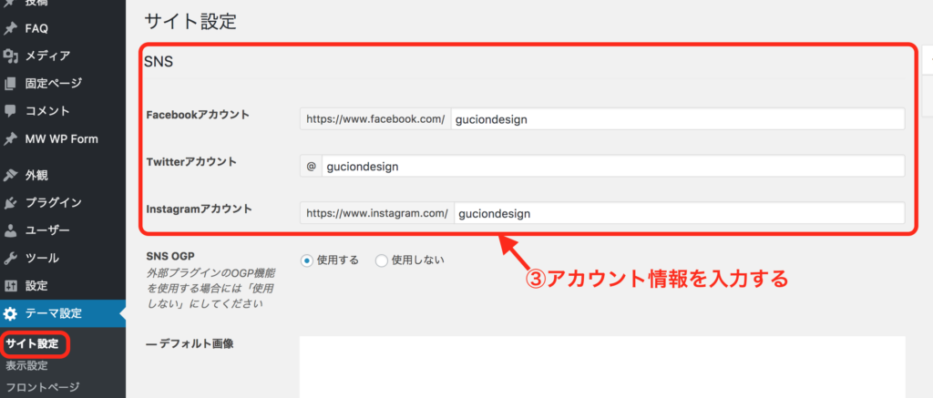 WordPress管理画面>テーマ設定>サイト設定>SNS