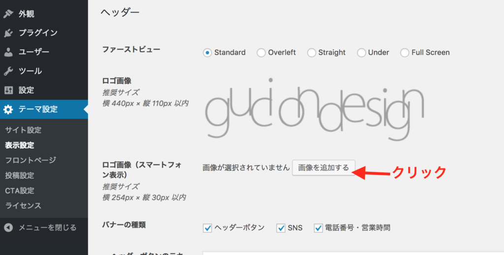 WordPress管理画面>テーマ設定>表示設定>ヘッダー>ロゴ画像