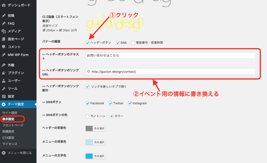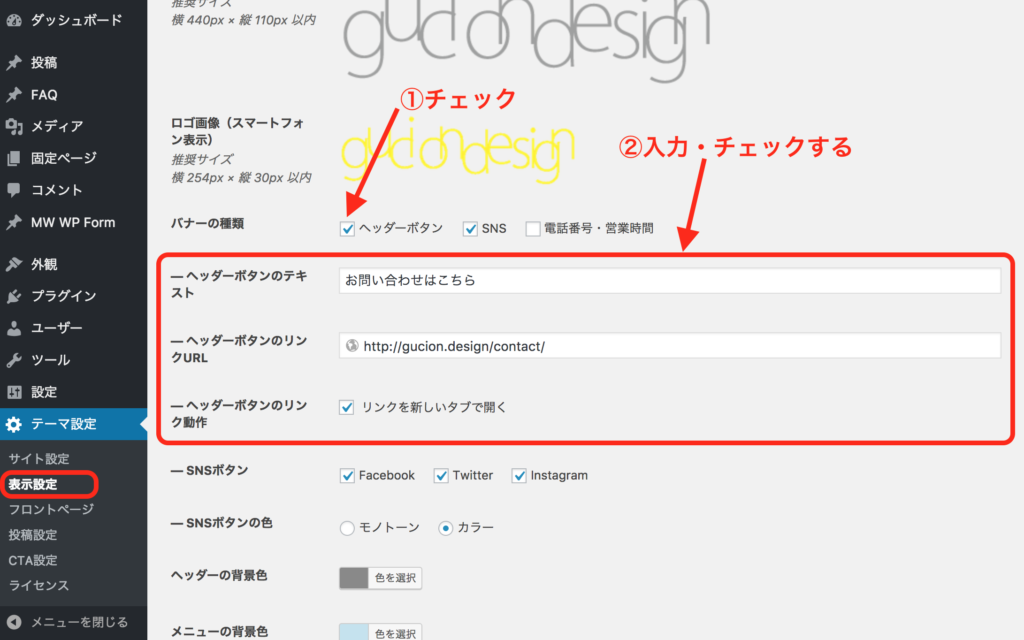 WordPress管理画面>テーマ設定>表示設定>ヘッダー>バナーの種類「ヘッダーボタン」にチェック