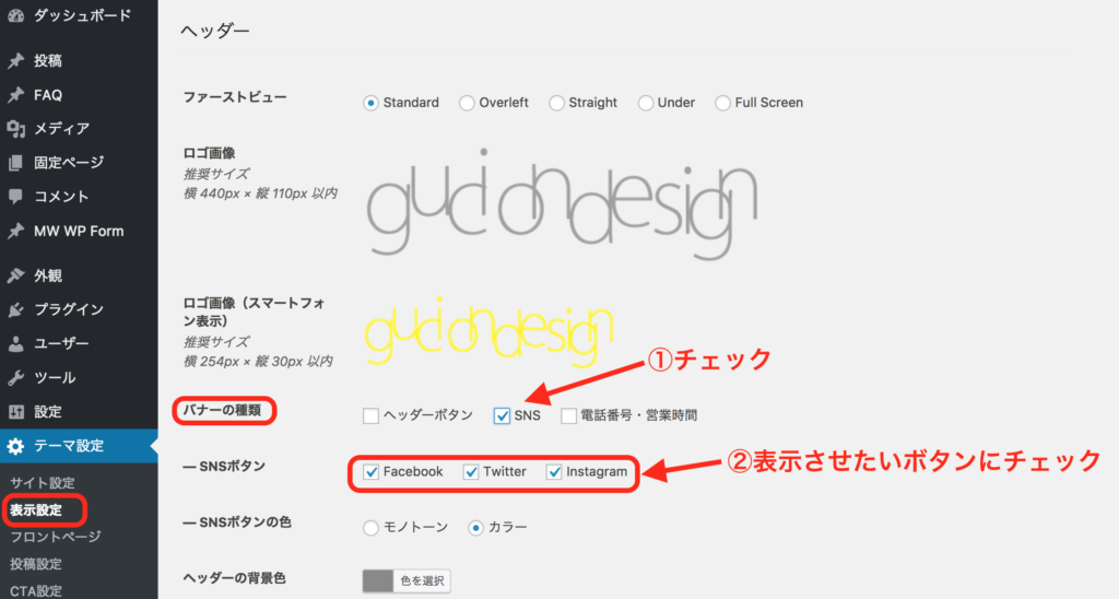 WordPress管理画面>テーマ設定>表示設定>ヘッダー>バナーの種類「SNS」にチェック