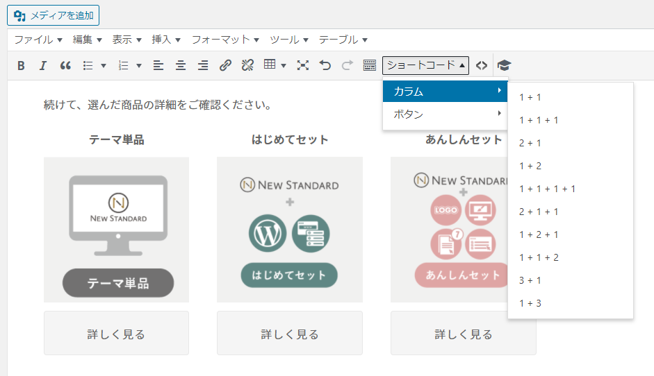 ショートコードからカラムへ進み、分割の仕方を選ぶだけ。