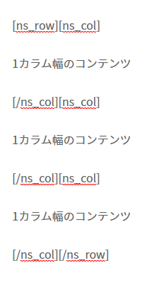 上のような文字が投稿欄に表示されるので、『1カラム幅のコンテンツ』というところを書き換えれば、3分割横並び表現が出来るのです。