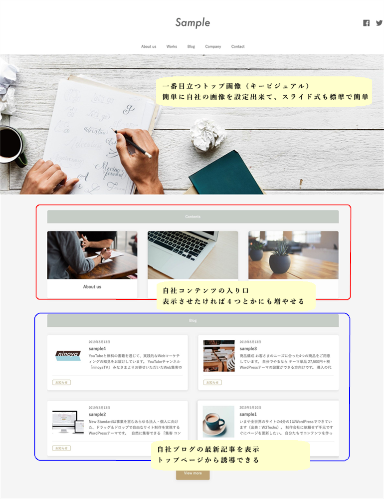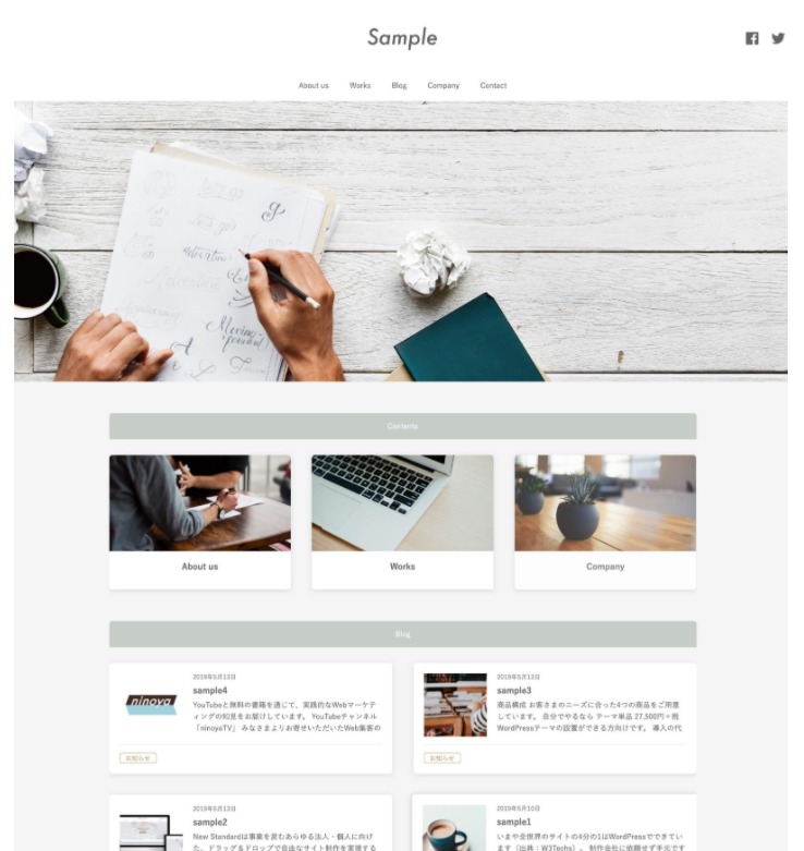 サンプルサイトを例に説明すると、上から順にキービジュアルを作成し、コンテンツを埋めていく感じです。