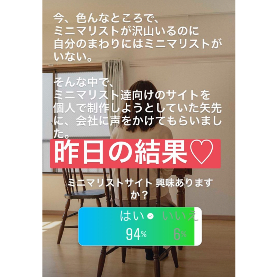 その他、行ったことは自分個人のInstagramのフォロワーさんに「ミニマリストサイトに興味ありますか?」という質問を投げかけてみました。以下、実際に投げた質問に対しての結果です。
