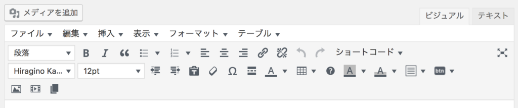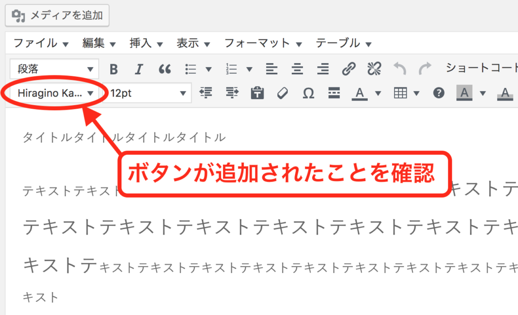 実際の記事の投稿画面を確認します。ビジュアルのメニュー内に、フォントサイズが変えられるボタンが、自動的に追加されました。