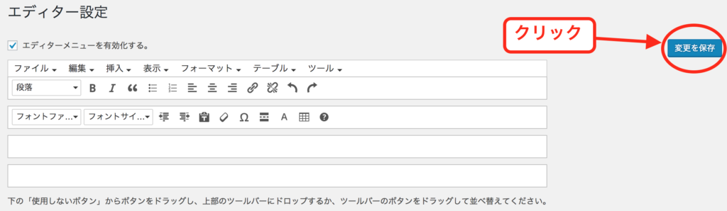 使用しないボタンの枠内から「フォントファミリー」ボタンを、エディターメニュー内へドラッグ&ドロップし、青色の「変更を保存」ボタンをクリックします。