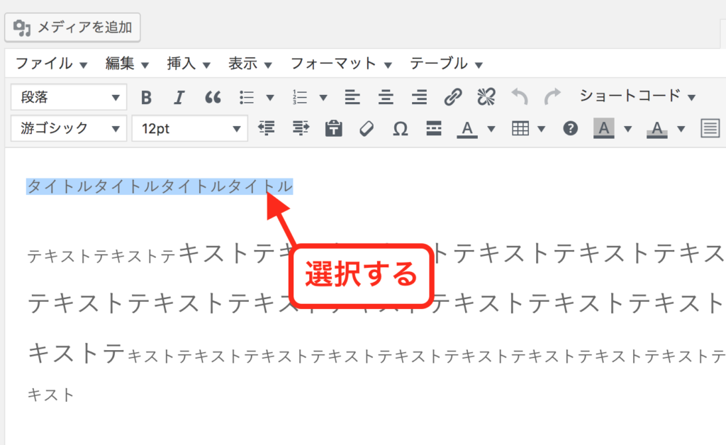 記事の本文内にて、フォントサイズを変更したい箇所を選択します。