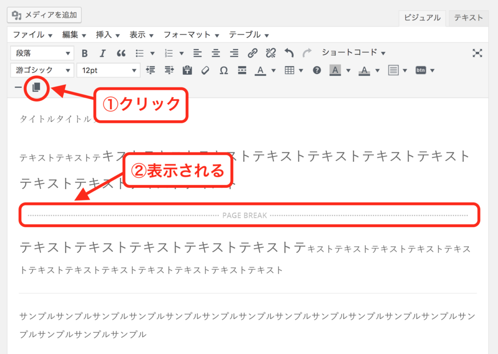 先ほどご紹介した横ライン機能は、文章中に線で区切るだけのものですが、今度は1つの記事を複数のページに分割する「改ページ」機能のボタンをご紹介します。