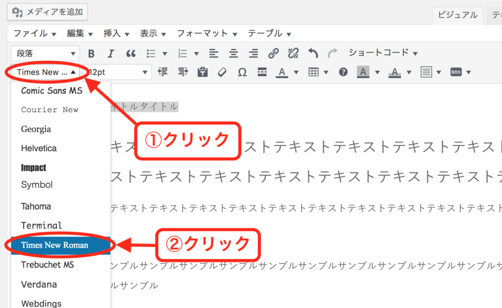 それでは、フォントの種類を変更してみましょう。こちらも、前述の方法「3.記事のフォントサイズを変更する」と同様です。