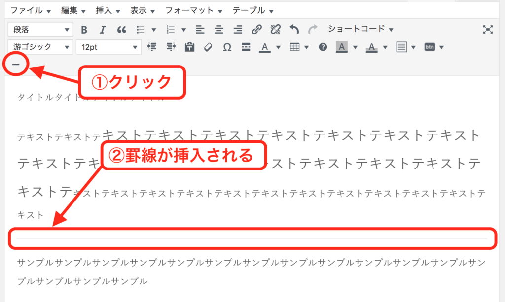 本文内に、横1本の罫線を入れ込む「横ライン」ボタンです。