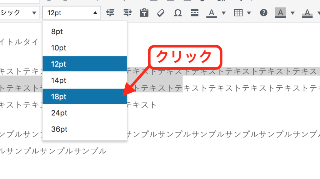 先ほど追加したフォントサイズのボタンをクリックし、サイズを選択します。ここでは、12ptのフォントを18ptに指定します。