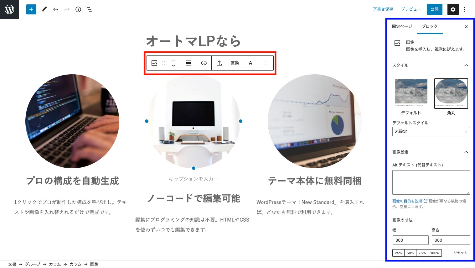 円形画像はスタイルで角丸を選び、画像サイズを正方形にすると作成できます。