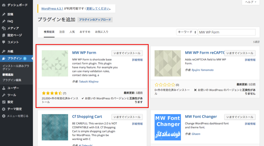 管理画面よりプラグイン>新規追加>画面右上の検索バーより「MW WP Form」を検索してください。