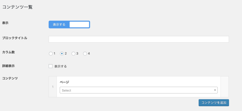 表示するページを選択できます。「コンテンツを追加」ボタンをクリックして、設定したカラム数に併せて選択しましょう。ページのタイトルの一部を入力すると検索もできます。