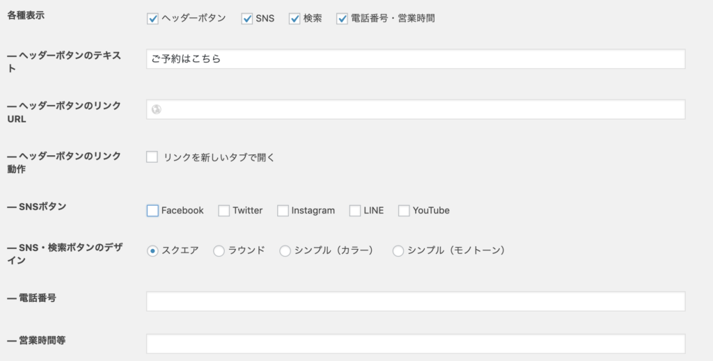 ヘッダー周りに表示させるボタンやアイコンを設定します。