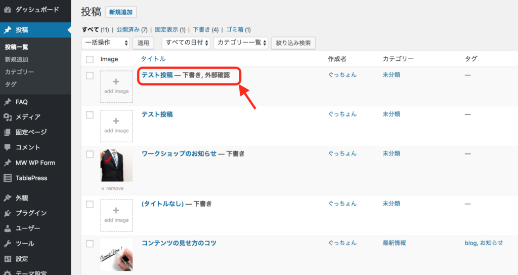 また、投稿一覧画面には、該当する記事に「外部確認」と表示されます。
