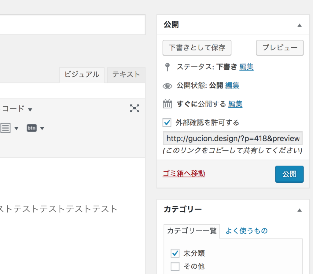 - 下書き状態の投稿画面より、画面右上「公開」欄にある「外部確認を許可する」にチェック