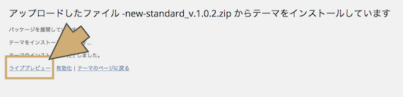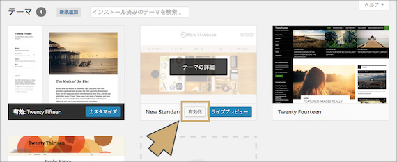 テーマが追加できたら、有効化をします。その前に、見た目を確認しておきましょう。