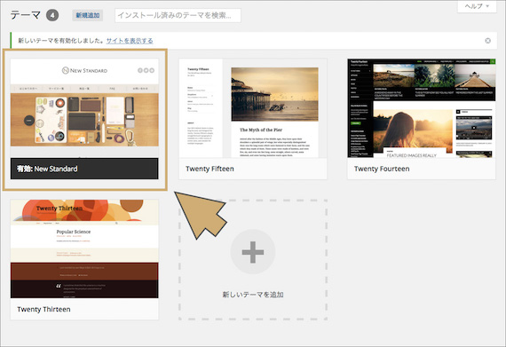 それでは新しいバージョンの「New Standard」を追加していきましょう。メニューバーの外観>テーマより、テーマ一覧画面の上にある「新規追加」をクリックしてください。