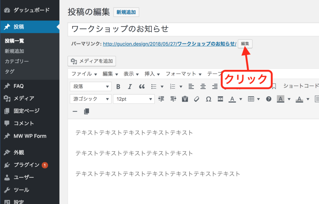 投稿編集画面のパーマリンク欄にある「編集」ボタンをクリックします。