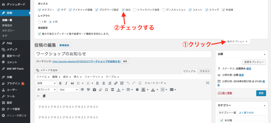 投稿の編集画面上部右の「表示オプション」をクリックし、オプションの中にある「SEO」ボタンにチェックします。